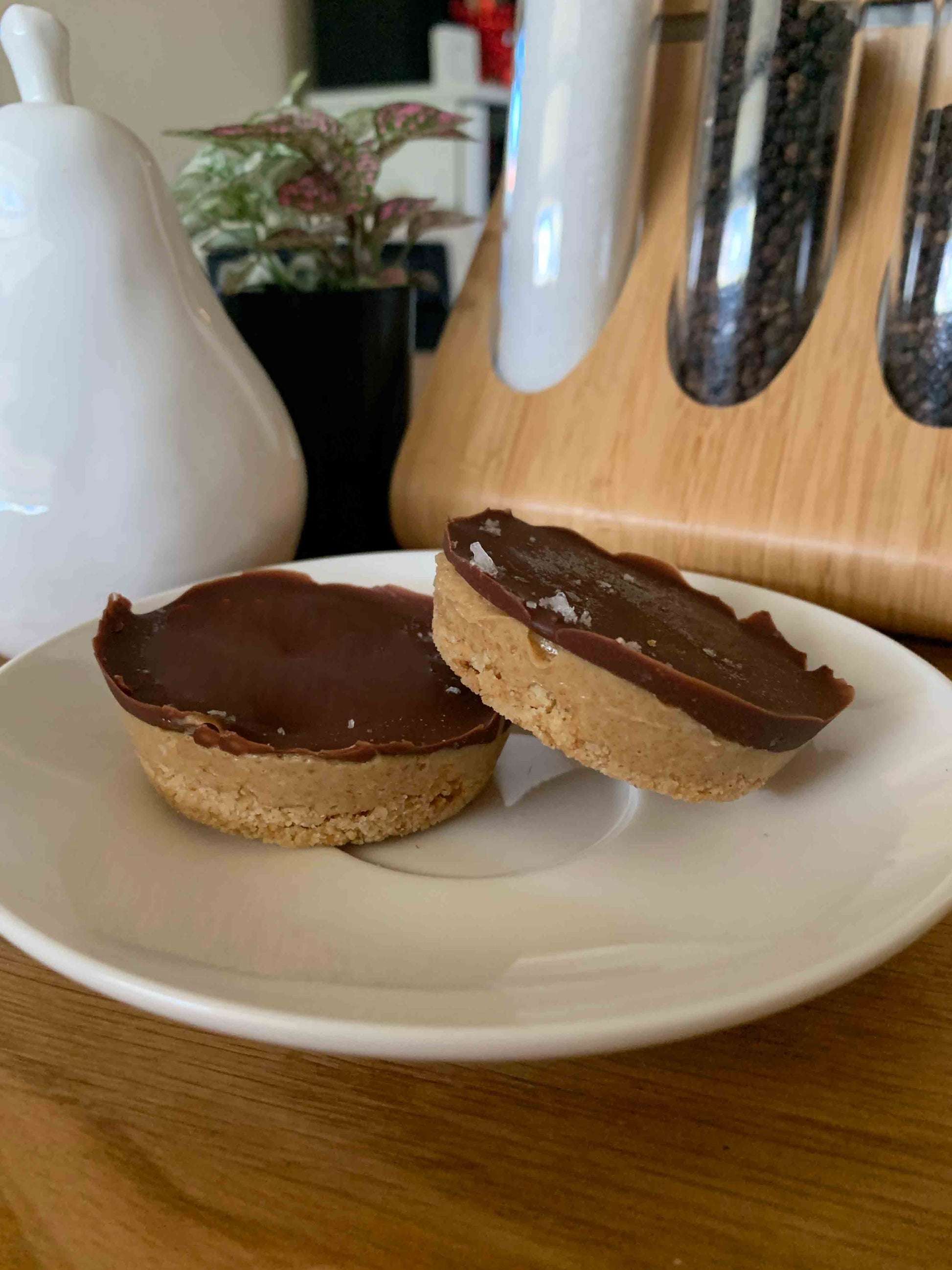 6. Melt dark choc chips and 1 tbl spoon coconut oil and spread over the caramel. Add a tiny sprinkle of salt flakes. Put in the freezer overnight before serving.