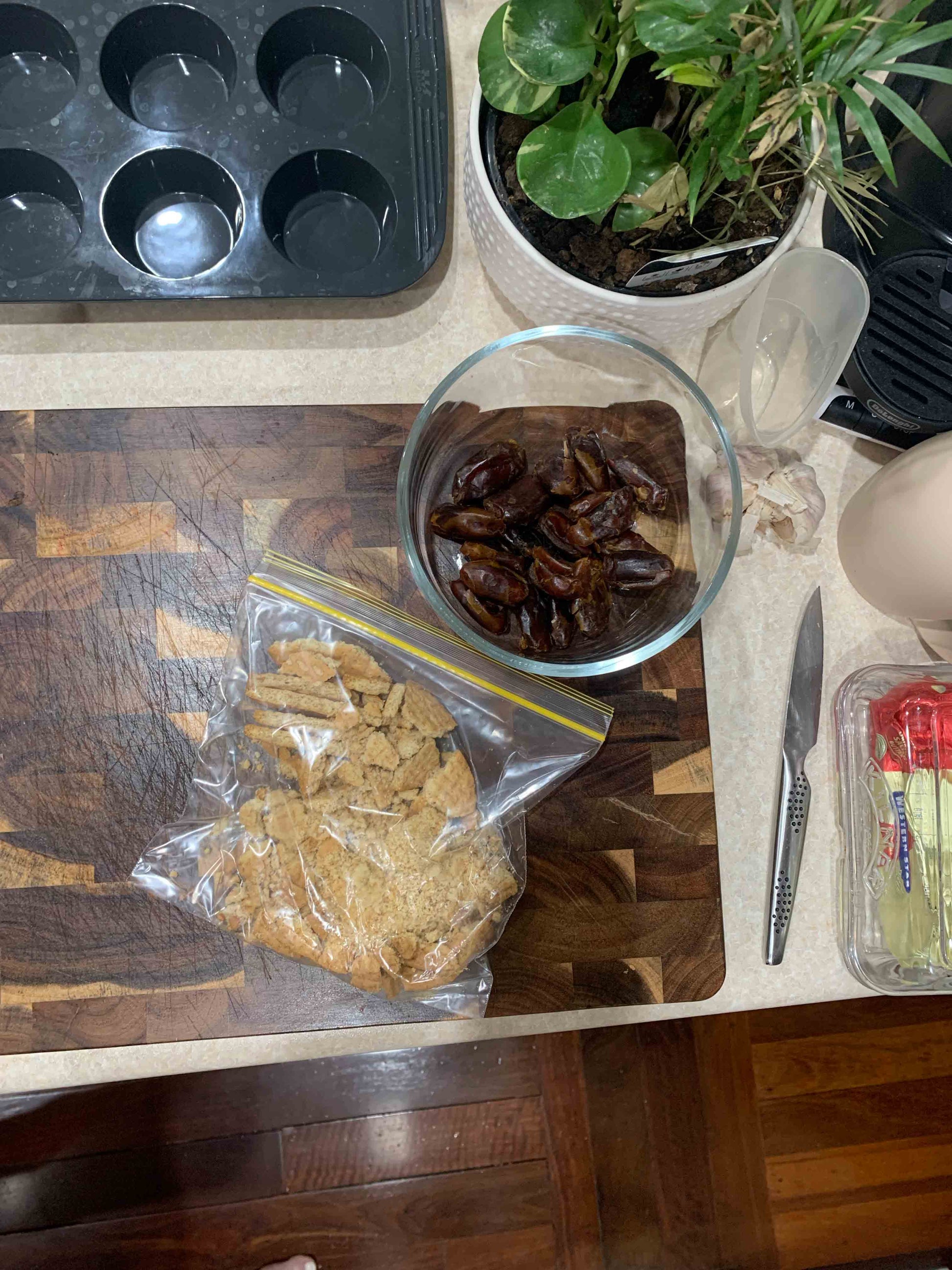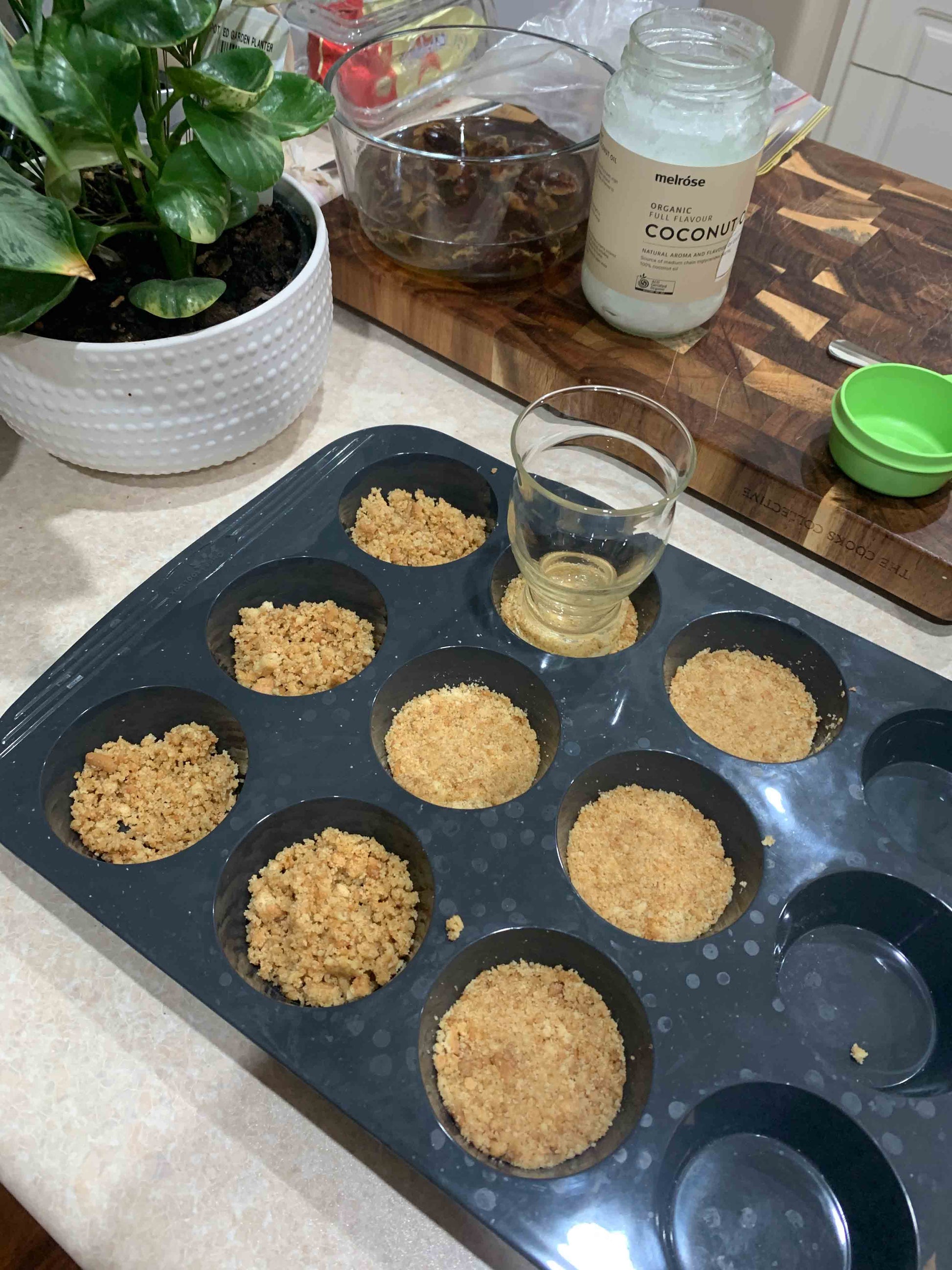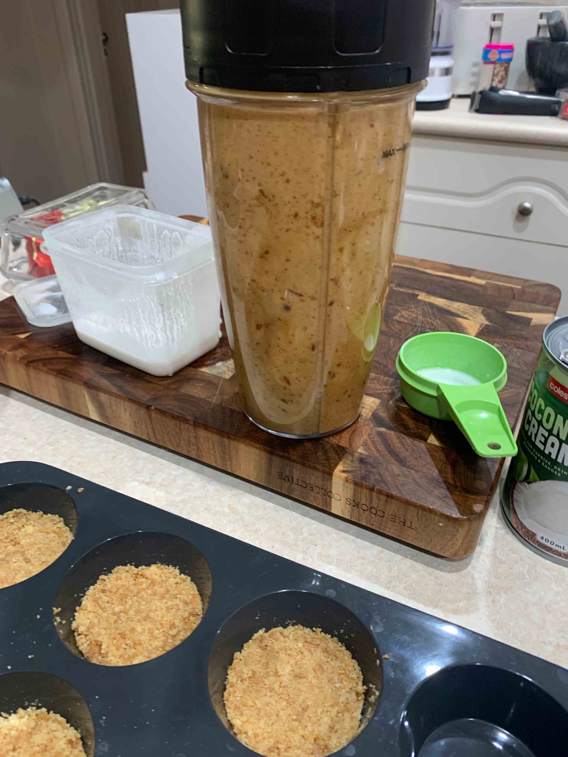 3. Melt 2 sml table spoons of coconut oil. Combine with biscuit crumb. Add to silicone moulds and flatten/compress the crumbs with a utensil.
