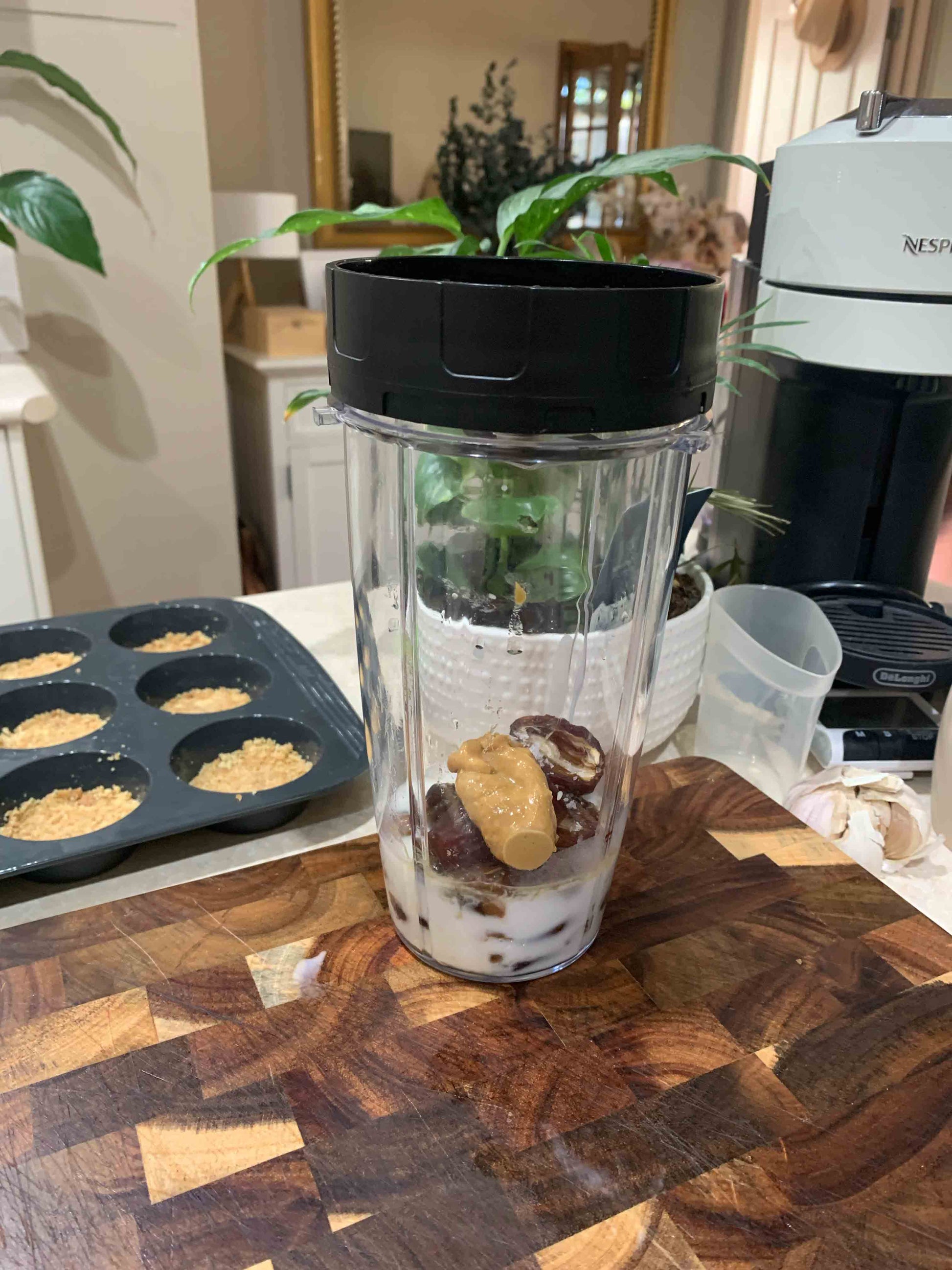 4. Add dates, coconut cream, peanut butter, vanilla essence, salt to a blender and blend until smooth and creamy. Add a very small amount of the left over date water to the blender until you get smooth consistency.