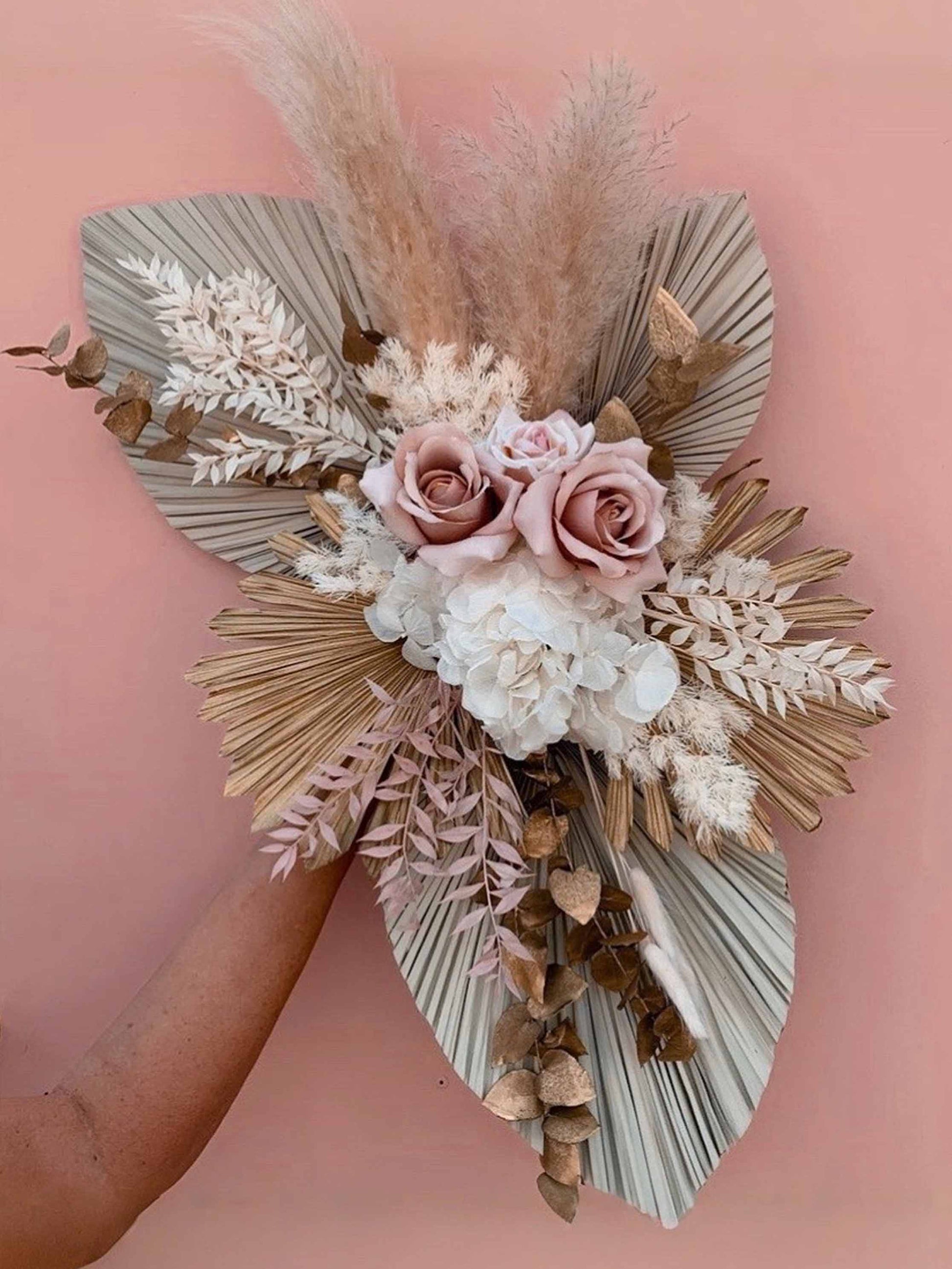 - Medium to large installation of dusty pink Faux flowers with gold, white and neutral tones. A mix of dried and artificial florals. Includes pampas.